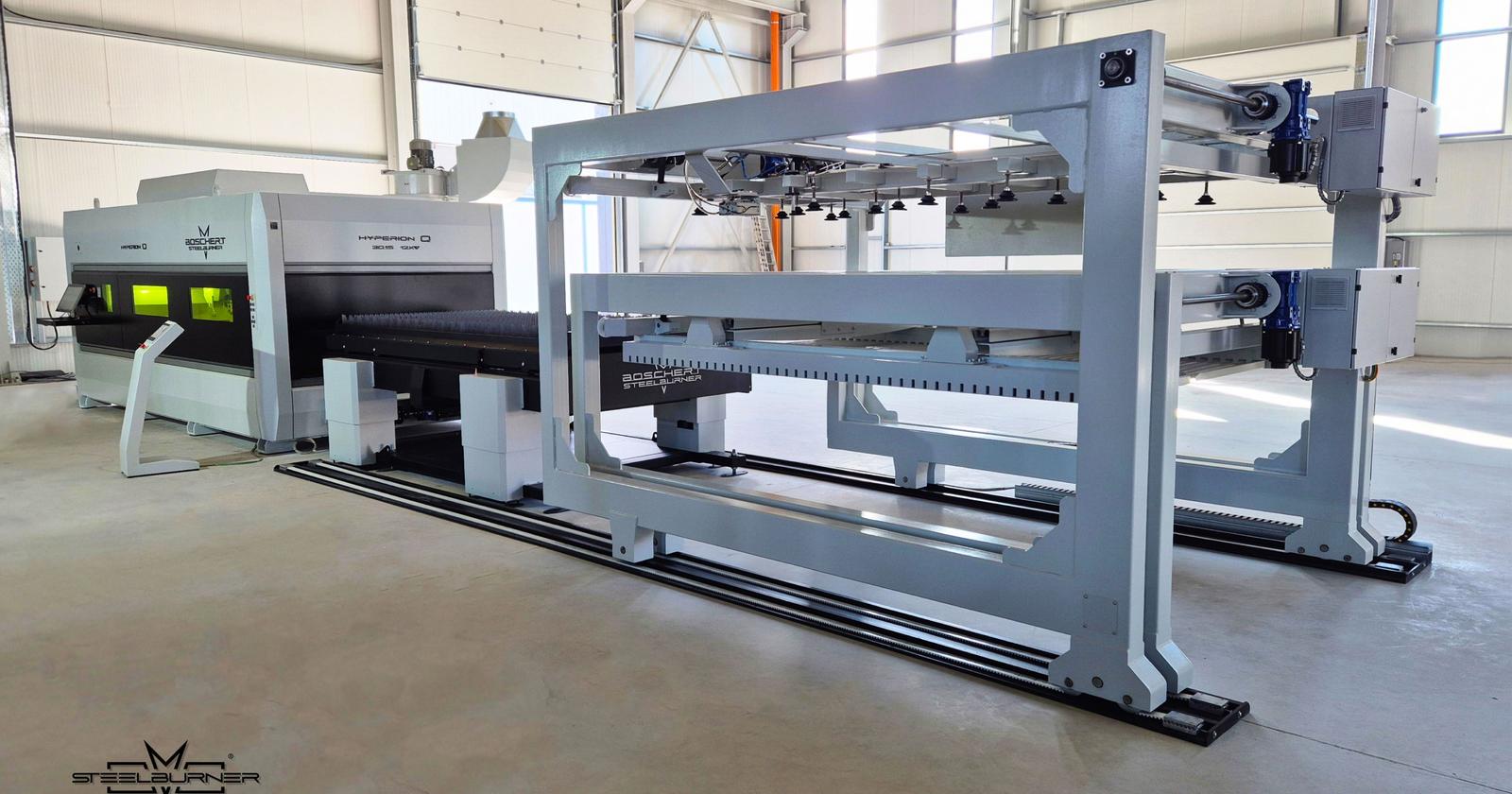 Steelburnerin markkinoille tuoma uutuus tasolasereihin. Levyn automaattinen lastaus- ja purkulaite. Levykoot 3000x1500 ja 4000x2000. Myös räätälöidyt levykoot, esim. 4300x1500. Levyn erottelu ja kaksoislevyn mittaus (estää kahden tai useamman levyn syötön laserin leikkuupöydälle). Leikatun levyn purkupöytä (mahdollisuus 2W purkupöytään eli jolloin leikatuille levyille on kaksi eri purkuosoitetta). Lastaus- ja purkulaite mahdollista ajaa kokonaan pois levyn vaihtopöydän edestä tällöin käsilastaus / painavien levyjen lastaus vaihtopöydälle mahdollista siltanosturilla tai trukilla. Automaattikäyttö suoraan koneen ohjaukselta tai manuaalikäyttö lastaus- ja purkulaitteen käyttöpaneelista. Kaikki vaaka- ja pystyliikkeiden liike servomoottoriohjauksella, johteet laadukkaat ja vahvat saksalaisen Rexrothin. Teräskudosvahvistetut hammashihnat takaavat jouhevat ja äänettömät liikkeet. Mahdollisuus varustaa levyn korkeavarastolla.